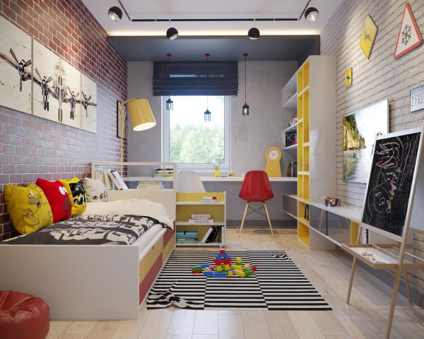 - При плануванні простору виділіть зони для відпочинку, навчання та ігор. Не потрібно відокремлювати їх перегородками. Просто подбайте про те, щоб кімната не була перевантажена меблями і в ній залишалося достатньо вільного місця.