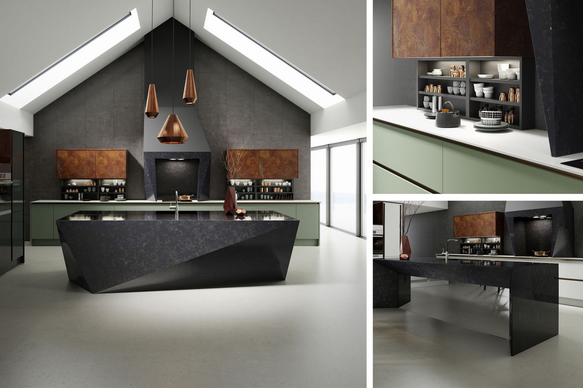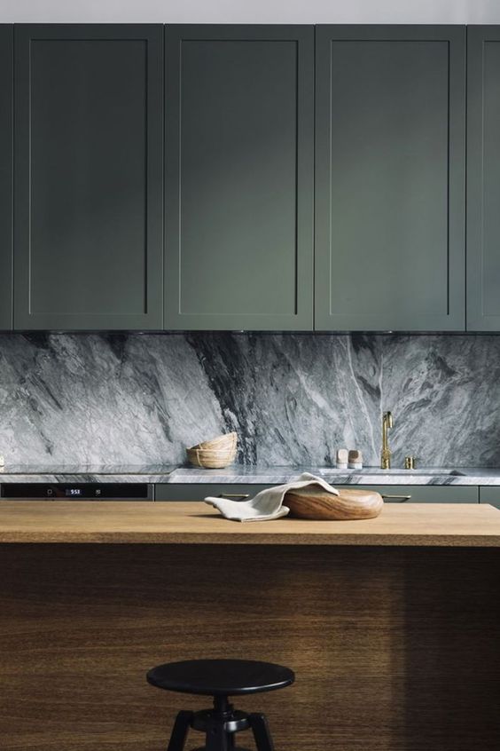 - Темні тони. Мармуровий фартух темних тонів гармонійно комбінується з шавлієвої кольору шафою і дерев’яним островом на кухні.