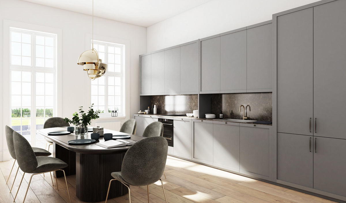У кухні завжди стильно виглядають відтінки благородного сірого. Шафи в графітових тонах гармоніюють з білим фартухом з мармуру і такий же стільницею. Хочете додати акцентні нотки? Виберіть чорний змішувач.
