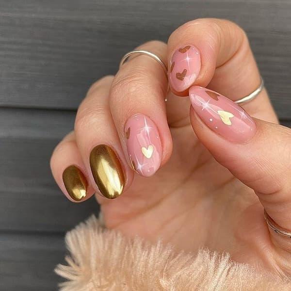 Якщо вам подобаються витончені акценти в манікюрі, придивіться до поєднання нюдового дизайну з вставками з фольги або поталі. Подібний декор стильно комбінується з абстрактним або флористичним стилем.