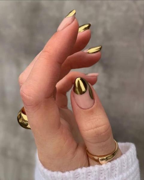 Надати нюдовому дизайну з блискітками 2023-2024 оригінальності може ефект рідкого металу на нігтики. Такий акцентний декор виглядає стильно і ефектно.