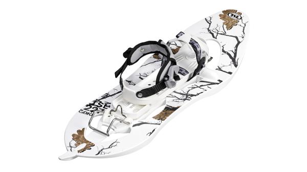 Ще одна масивна модель, вона також витримає вагу в 110 кілограм, але підійде для пересування буквально по будь-якому снігу, навіть якщо він випав буквально кілька годин тому. Виготовили ці снігоступи на основі алюмінієвої рами, в конструкції є кішки і спеціальна пластикова вставка для того, щоб збільшити опору. Ремені можна регулювати під обсяг стопи і швидко знімати. Підошва не спадає навіть при активному бігу по заметах, і все це можна купити за ціною від 5300 тисяч рублів!