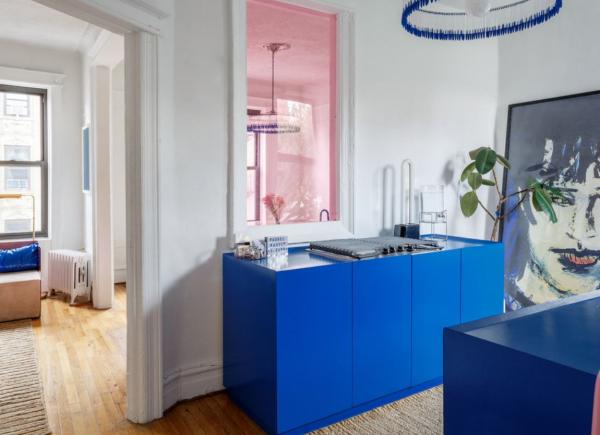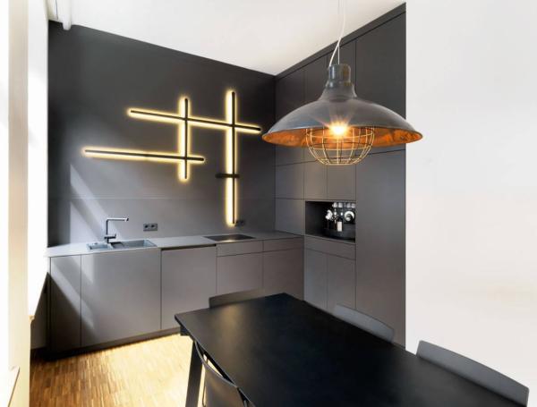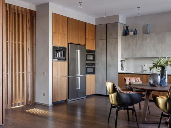 При цьому не завжди вистачає шафок, щоб заповнити всі поверхні стін. Тому одну заповнюють меблями повністю, а другу доповнюють їдальнею групою. Рекомендована відстань між шафами має становити від 1,5 до 2 метрів.